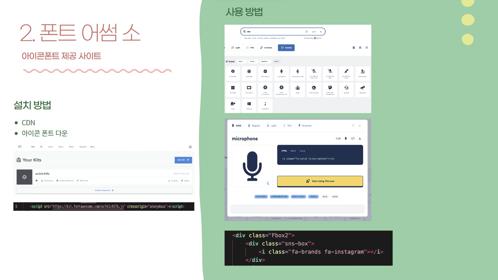폰트 어썸 사이트를 소개하며 아이콘을 넣는 방법에 대해 학습합니다.