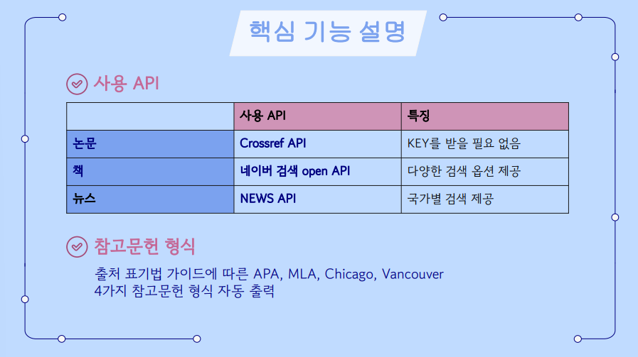 - API를 사용하여 논문, 책, 뉴스의 출처 표기법에 따른 참고문헌 형식 제공