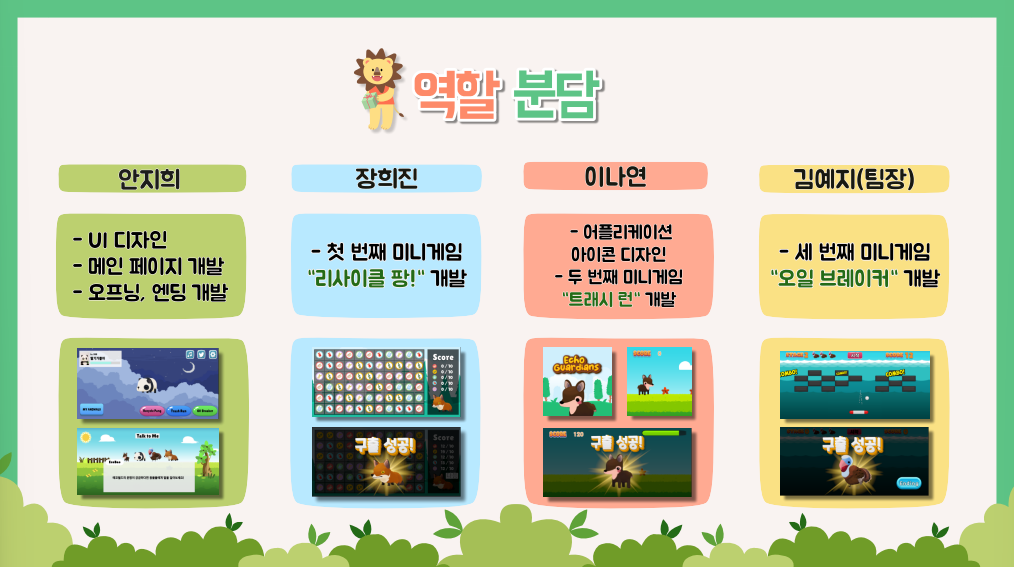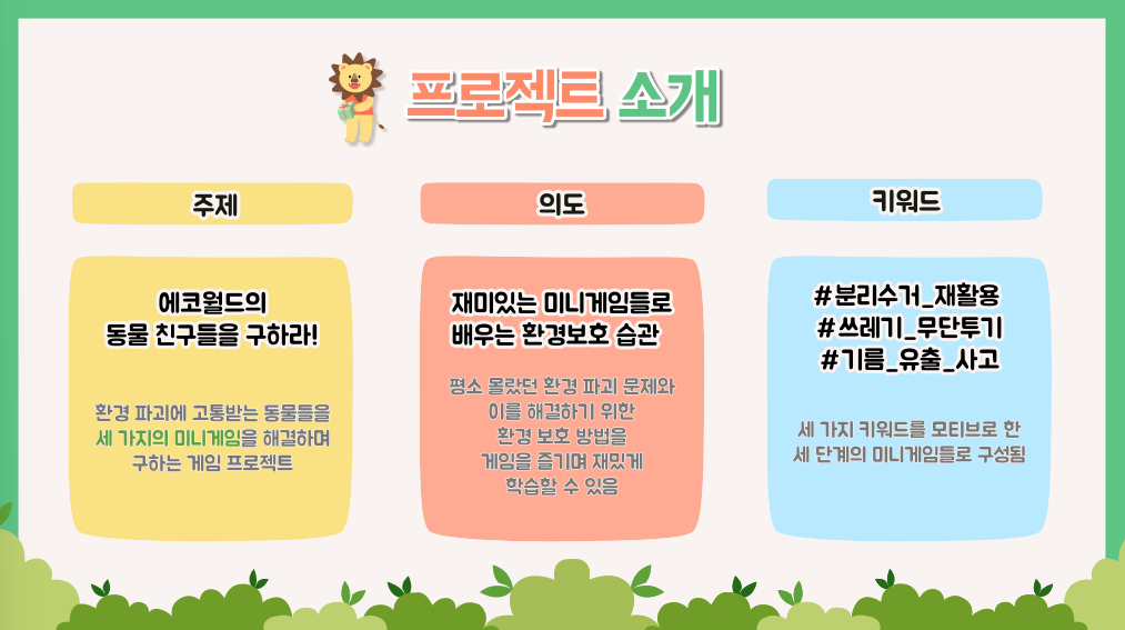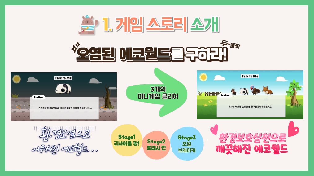 프로젝트 설명 : 환경 파괴에 고통받는 동물들을 세 가지의 미니게임을 해결하며 구하는 게임