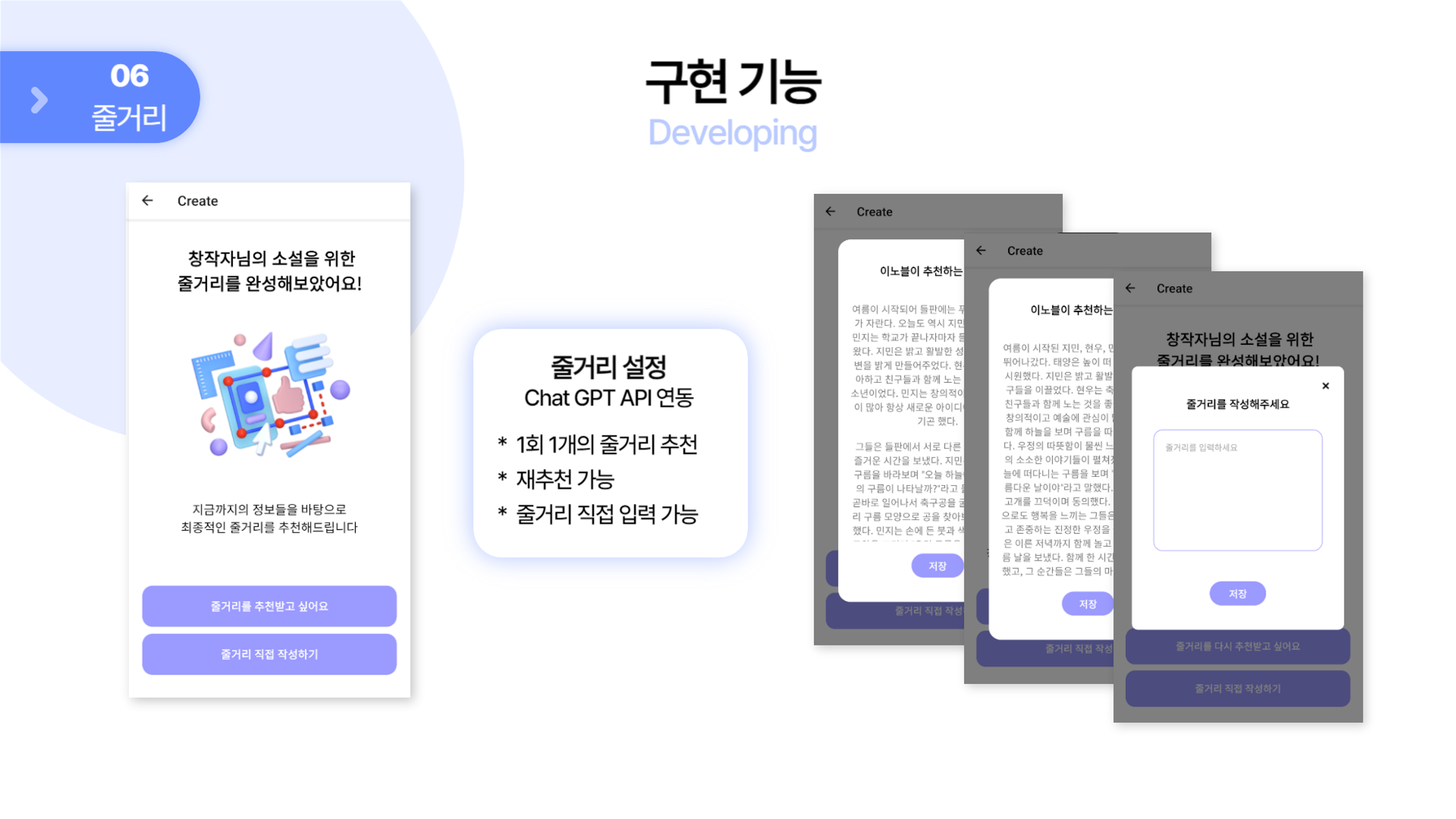 - Chat GPT API 연동 기능 구현 - 주제 추천 및 재추천, 등장인물 추천 등