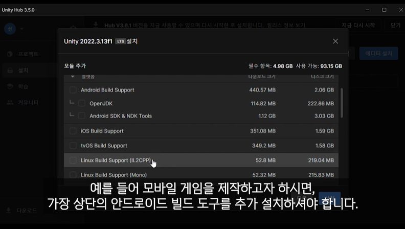 (예: 모바일 게임의 경우 안드로이드 빌드 모듈 추가)