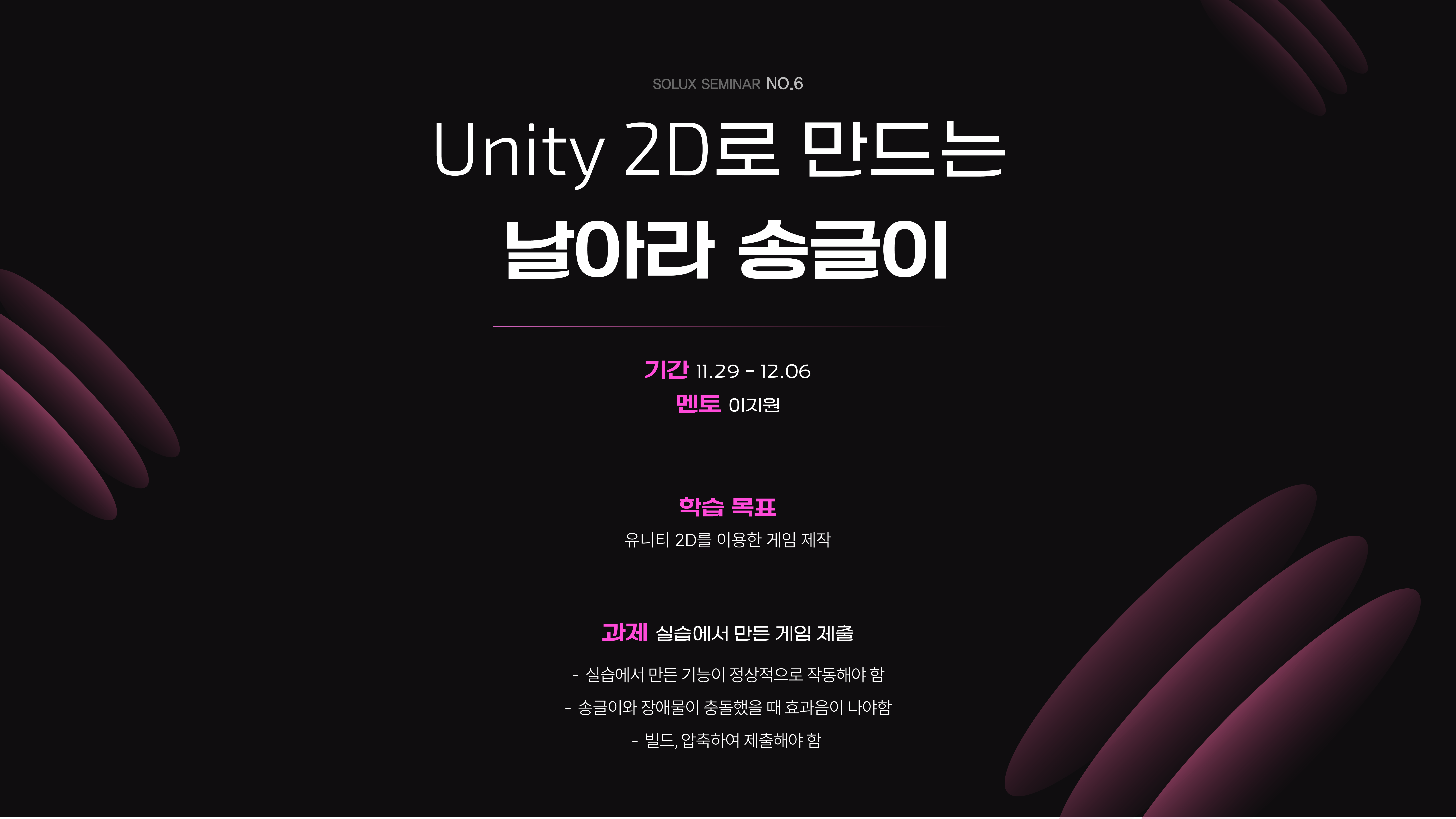 이번 세미나에서는 [Unity 2D로 만드는 날아라 송글이]를 주제로 다뤘는데요!