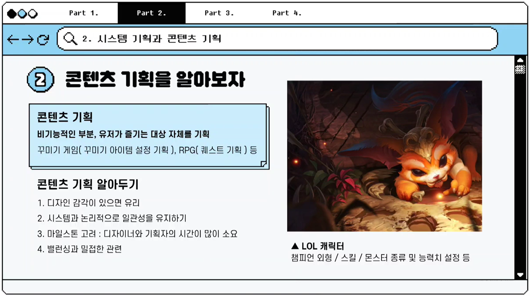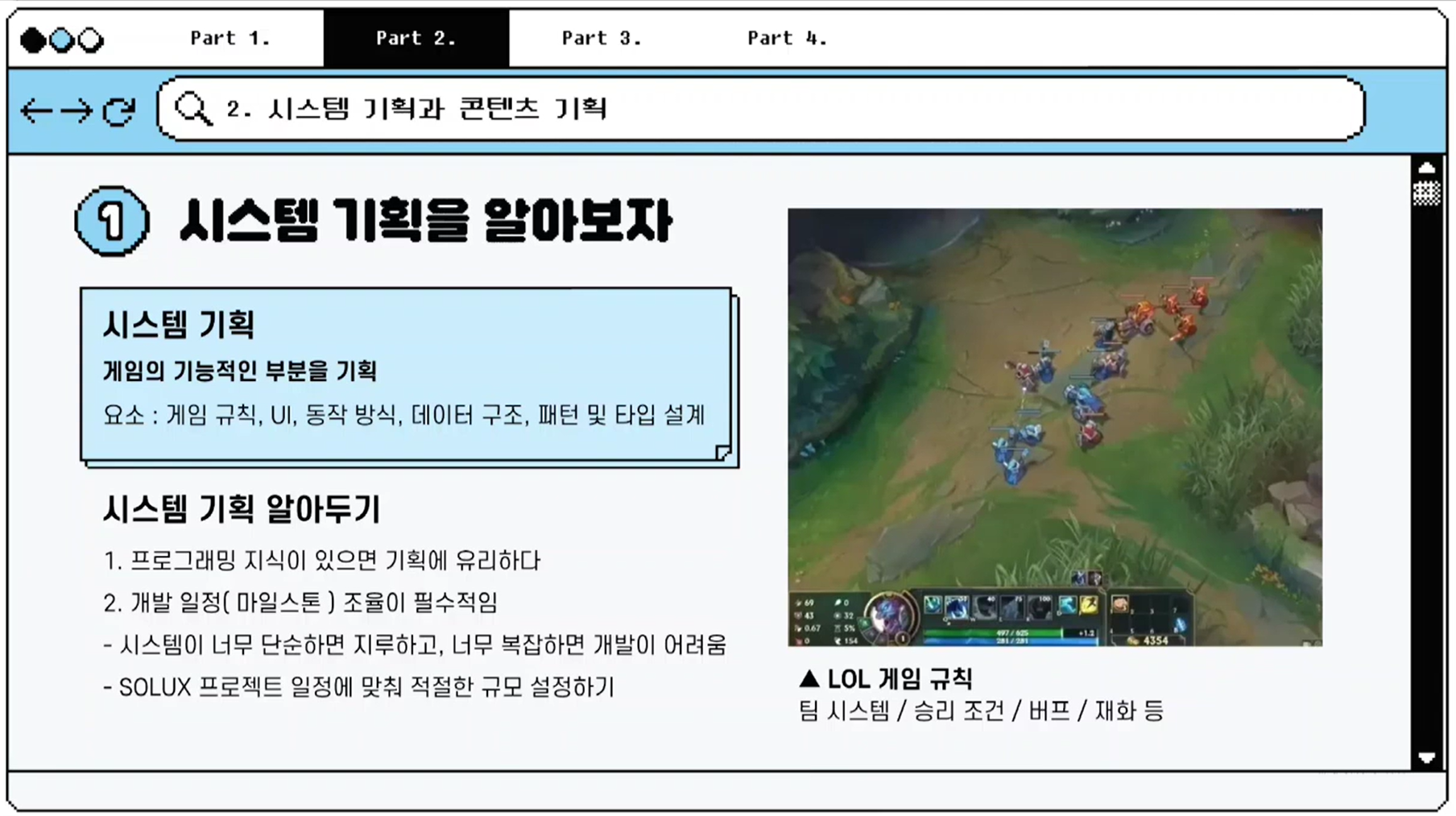 이 때 시스템 기획은 게임의 규칙, 동작 방식, 데이터 구조 등 기능적 요소를 정의하는 작업이며, 콘텐츠 기획은 꾸미기, RPG처럼 유저가 즐기는 대상 자체를 기획하는 것을 의미합니다.