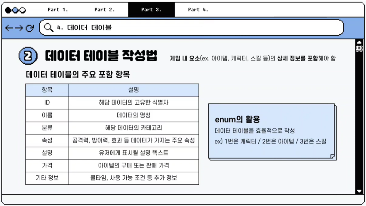 데이터 테이블은 캐릭터 능력치, 아이템 정보 등 게임 내 다양한 데이터를 체계적으로 정리한 표입니다.