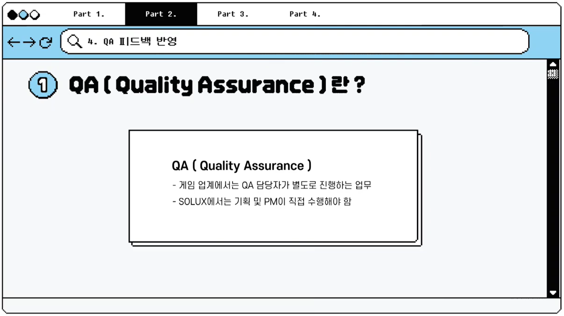 QA(Quality Assurance)는 유저의 자유도를 보장하는 동시에 게임의 기획 의도가 왜곡되지 않도록 하기 위해 꼭 필요한 작업입니다. 특히 사용자 관점에서 진행되어야 한다는 점이 중요합니다.