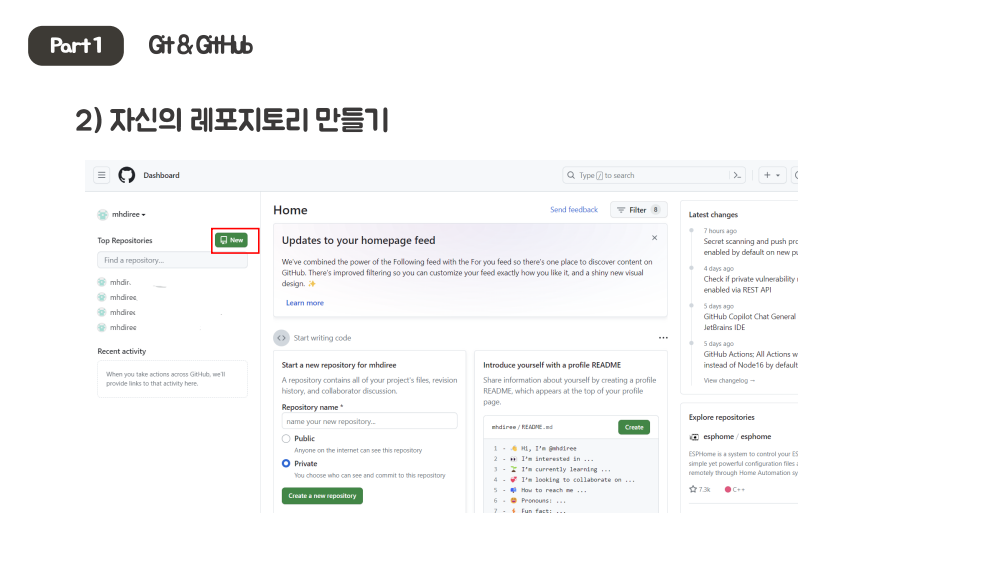 깃허브 계정을 생성하여 새로운 레포지토리(repository)를 만들어보았습니다.