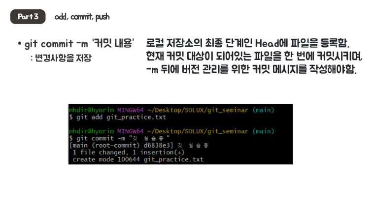세 번째 파트에서는 앞서 배운 명령어들을 실제로 사용하여 깃 저장소를 연결하고 파일을 관리하는 실습을 진행하였습니다.