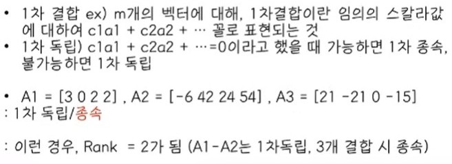 - 1차 종속 / 1차 독립 : c₁a₁ + c₂a₂ + ... = 0 이라 했을 때 가능하면 1차 종속, 불가능하면 1차 독립