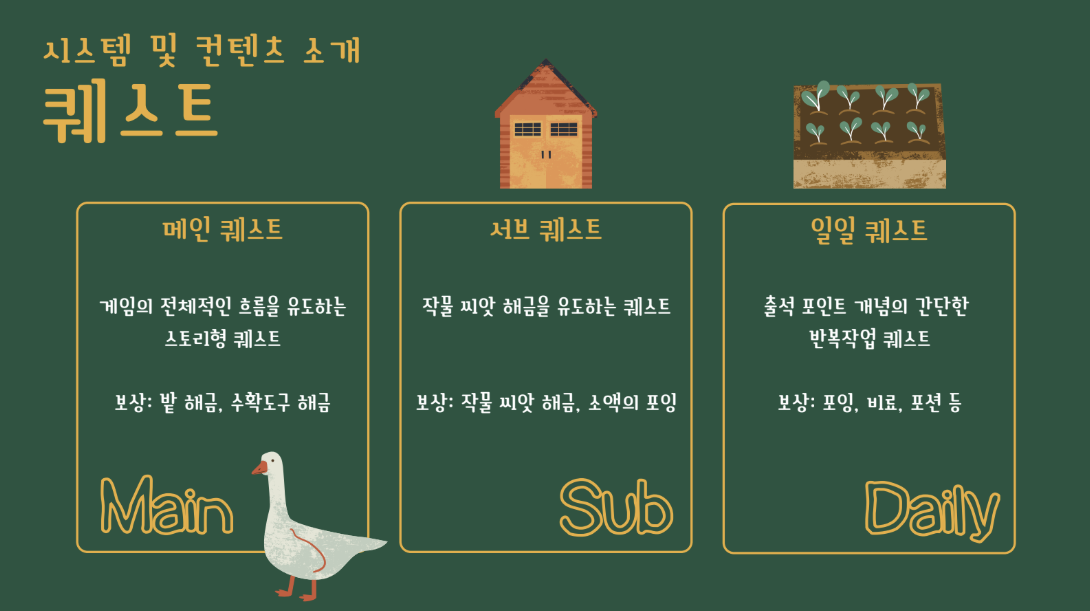 - 퀘스트 시스템 : 스토리형 메인퀘스트, 씨앗 해금 보상의 서브퀘스트, 매일 갱신되는 일일퀘스트 구현