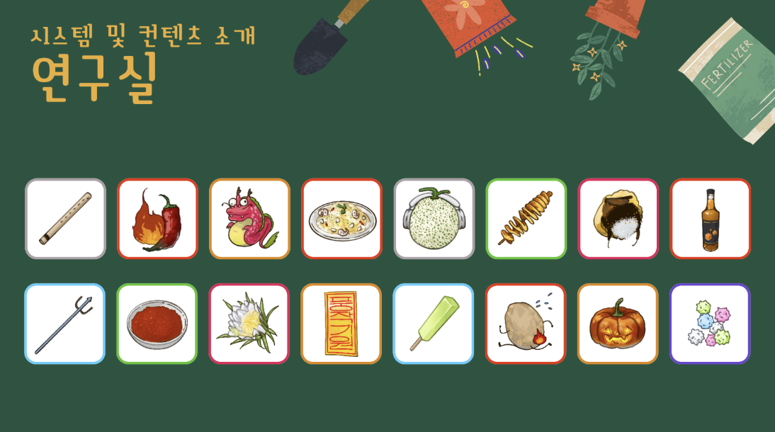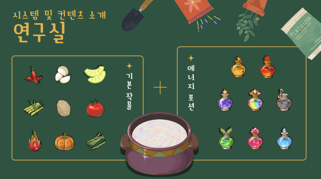 - 연구실 시스템 : 여러 작물과 포션을 조합해 신비로운 작물을 탄생시키는 콘텐츠 구현