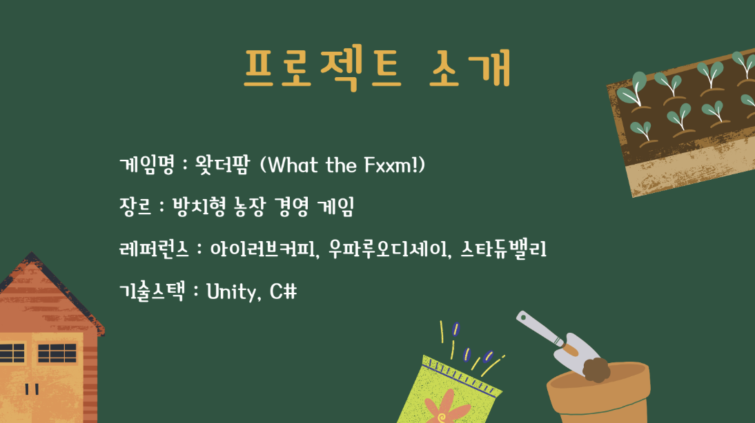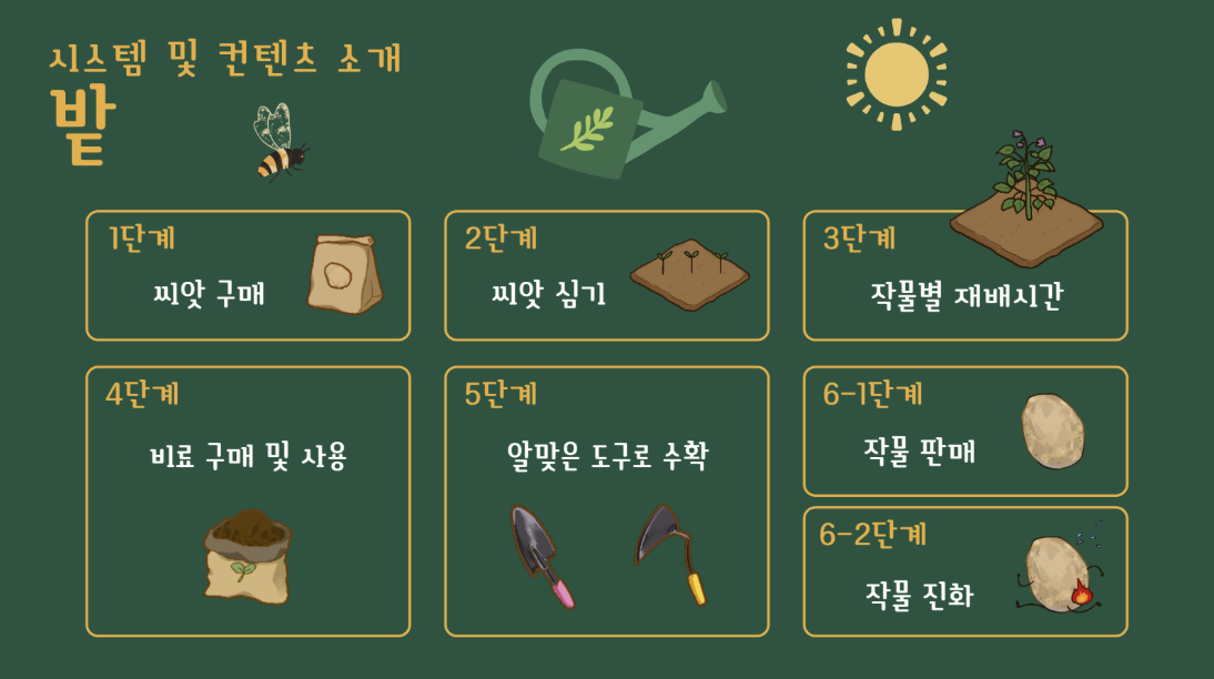 - 농장(밭) 시스템 : 메인 화면에서 작물 심기 - 비료 주입 - 수확 액션 구현, 작물별 상이한 성장 시간 적용