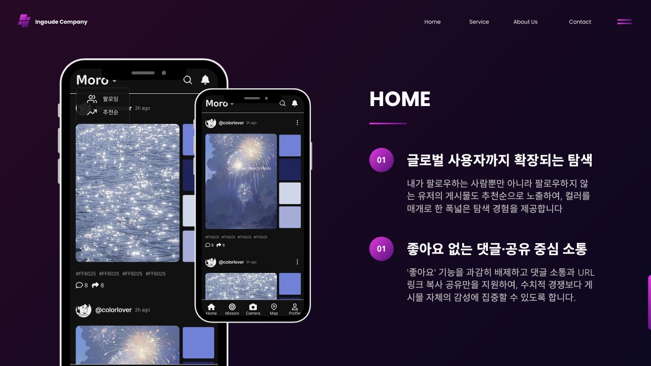 - 홈 : 글로벌 게시물 탐색 및 댓글/공유 중심의 소통 기능 구현