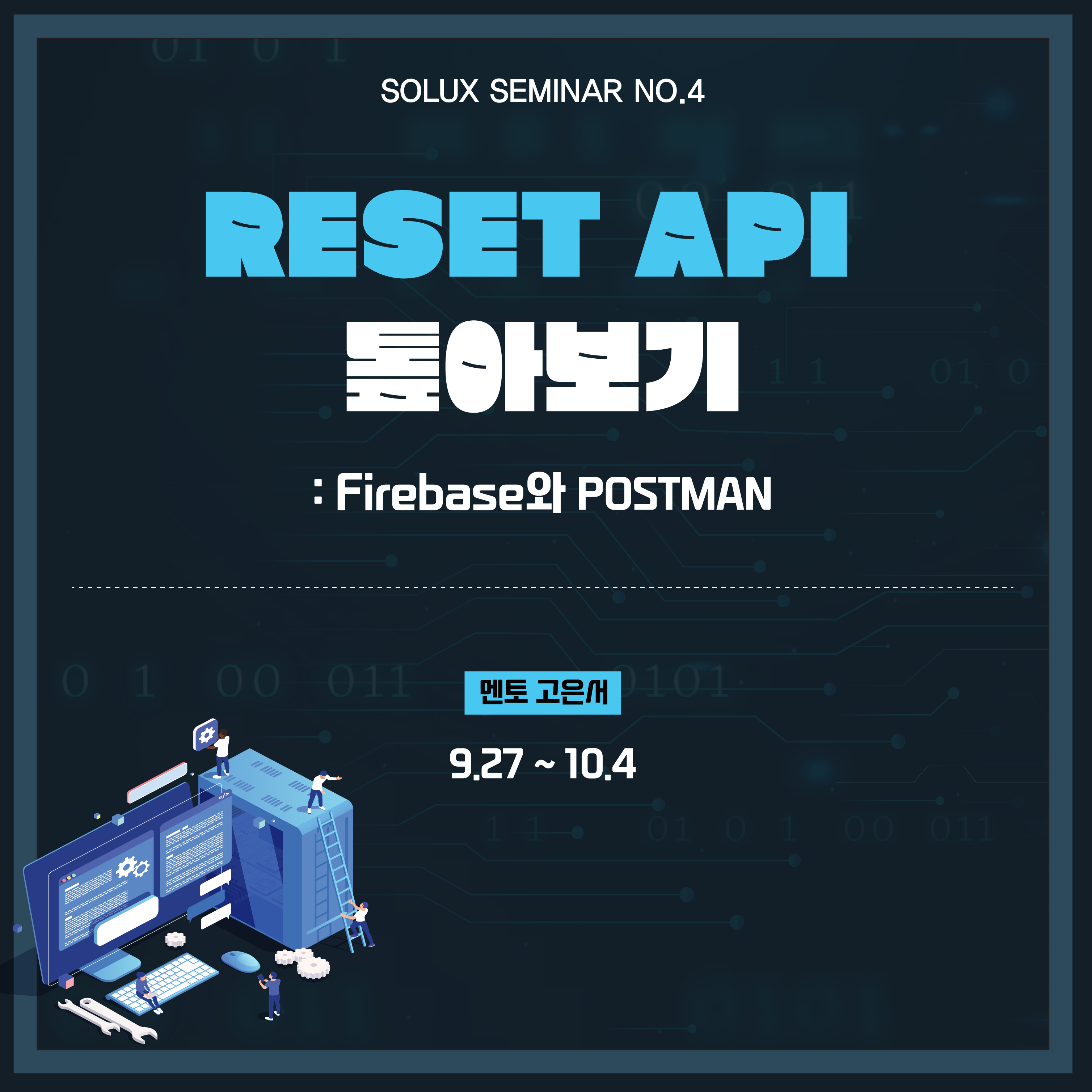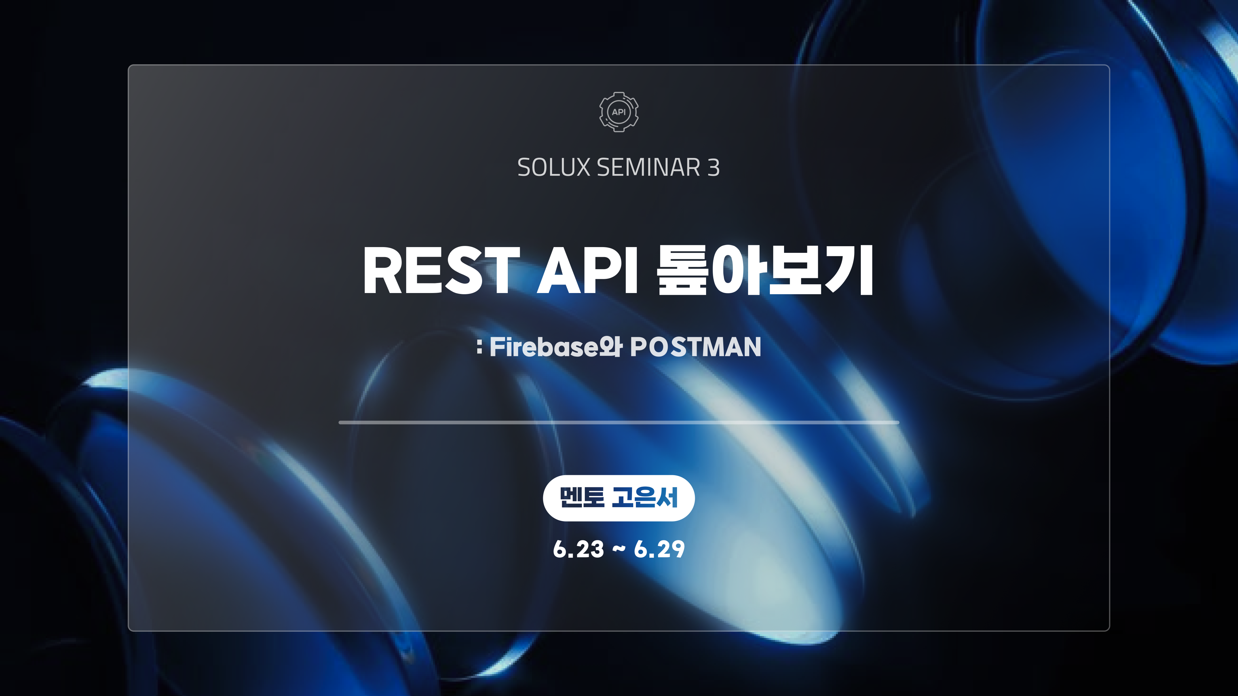 어느덧 솔룩스의 1학기 프로젝트는 최종발표회를 앞두고 있습니다! 그 전에, 솔룩스에서는 3차 세미나가 6/23 (월) ~ 6/29 (일) 일주일 동안 이루어졌습니다. [ REST API 톺아보기 : Firebase와 POSTMAN ] 를 어떤 방식으로 풀어나갔는지 함께 확인해볼까요? 주제 기간 6 / 23 (월) ~ 6 / 29 (일) 세미나 소개 고은서 멘토님께서 진행해 주신 이번 세미나에서는 REST API에 대해 학습하고, Firebase로 DB 서버를 구축하여 POSTMAN으로 테스트를 진행하는 것까지 학습해봤습니다. 내용1. REST API * REST API 먼저, REST API란 Representational State Transfer의 약자로, 웹의 기..